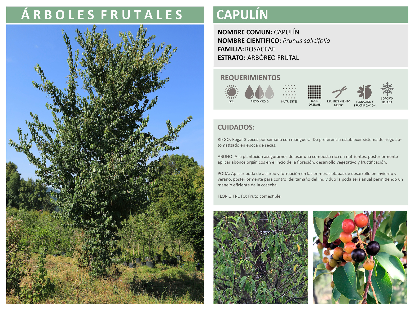 PODA: Aplicar poda de aclareo y formación en las primeras etapas de desarrollo en otoño e invierno, posteriormente para control del tamaño del individuo la poda será anual permitiendo un manejo eficiente de la cosecha. Floración verano. Fructificación en primavera, verano e invierno.