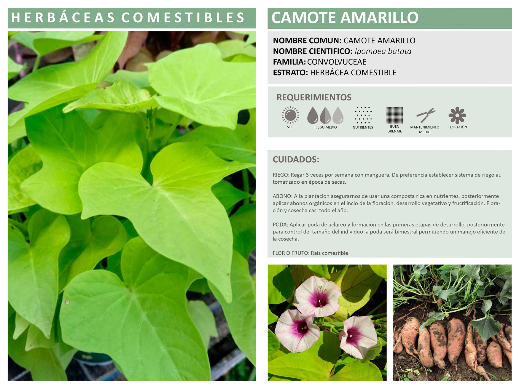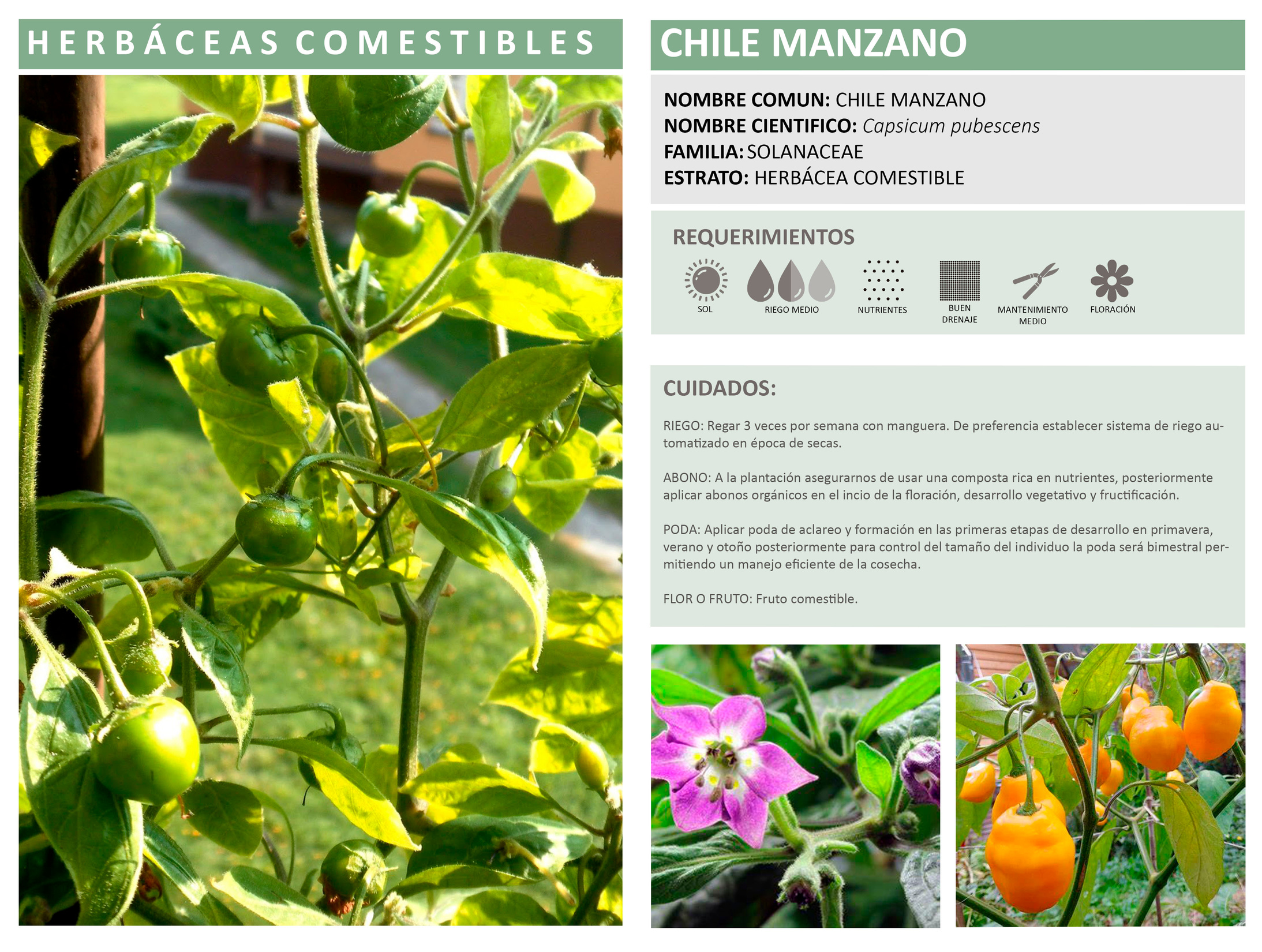 ABONO: A la plantación asegurarnos de usar una composta rica en nutrientes, posteriormente aplicar abonos orgánicos en el inicio de la floración, desarrollo vegetativo y fructificación.