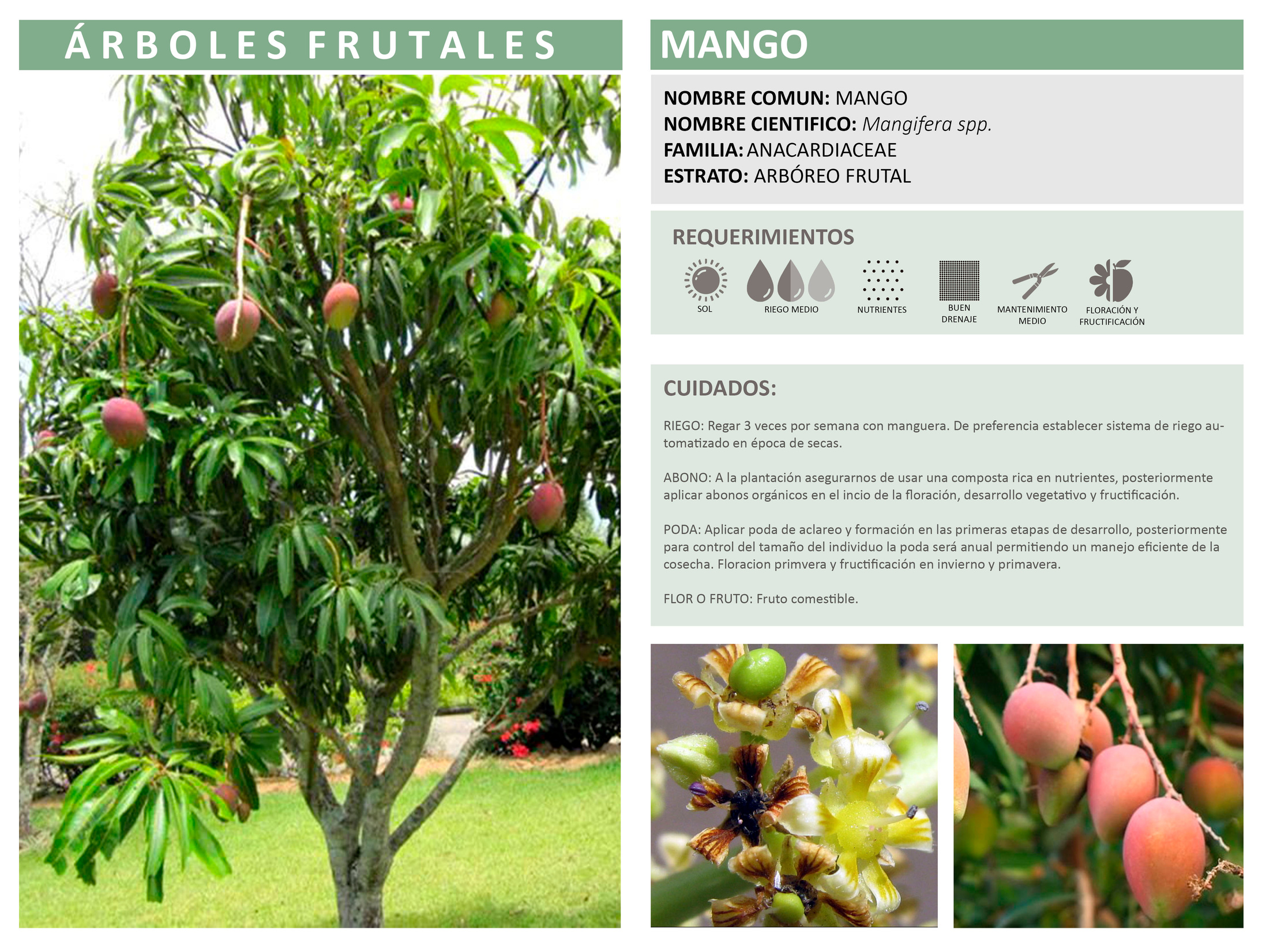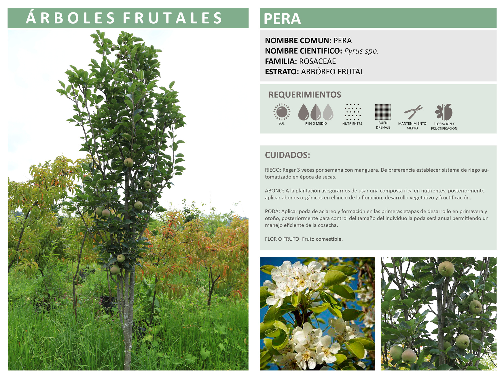 PODA: Aplicar poda de aclareo y formación en las primeras etapas de desarrollo en otoño e invierno, posteriormente para control del tamaño del individuo la poda será anual permitiendo un manejo eficiente de la cosecha. Floración y fructificación en primavera e invierno.
